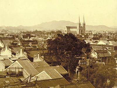 广州的新地标,摘自《A Tour of Old Canton》1906年的广州石室教堂,背景为白云山