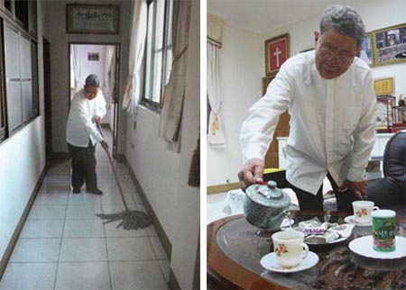 退休后,单枢机每天自己打扫卫生,招待客人,亲自斟茶。