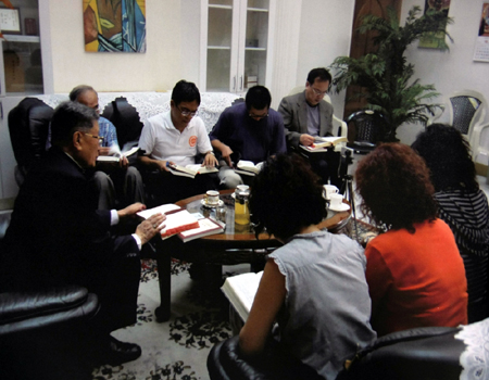 单枢机为慕道者讲道,分享圣经,参与者多为夫妇同行