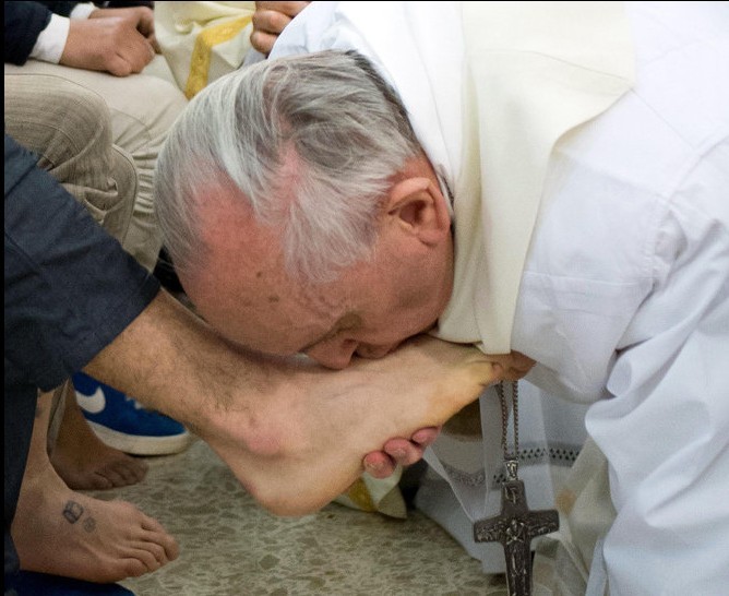 于是,教宗方济各做了两千年前耶稣所做的事,他跪在地上,为12位少年洗脚,然后擦干,又给予亲吻。12人中有2位女孩,有几位穆斯林。教宗如此的举动使他先前所说的“在我们中间居最高位的,应该为他人服务”这句话,变得具体、可见。同时,也把看到耶稣为门徒洗脚所受的感动,有力地传递给了感化院的少年们。