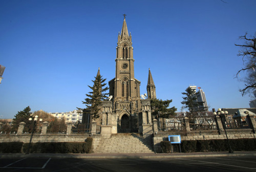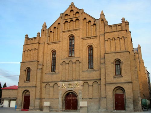 呼和浩特天主堂:位于内蒙古自治区首府呼和浩特的耶稣圣心主教座堂,1924年建成,原由比利时圣母圣心会管理,建筑风格也富于比利时特色,正立面呈山字形,高约25米,宽约20米,建筑面积约600平方米,教堂侧翼有30米高钟楼。-The Sacred Heart of Jesus Cathedral in Hohhot, Inner Mongolia Autonomous Region