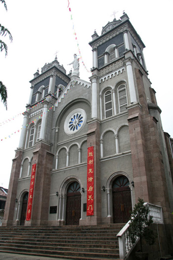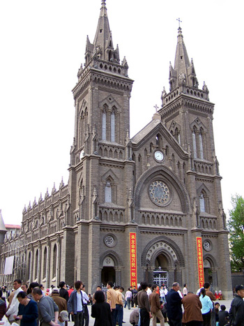 太原天主堂:圣母无染原罪主教座堂(又称太原总堂),罗马式建筑,座落于山西省会太原市区,由意大利方济会传教士建于1905年,四周原有许多附属建筑物,包括男、女修院、育婴堂、学校和印书馆等,如今部分痕迹尚存。2005年总堂举行百年庆典前夕,完成了首次全面维修。-The Cathedral of Immaculate Conception in Taiyuan, Shanxi province