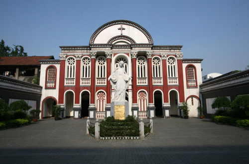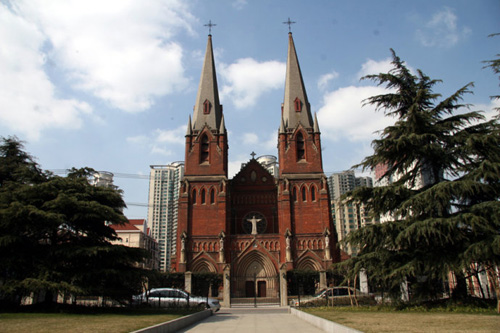 徐家汇天主堂:徐家汇主教座堂屹立于上海第一位天主教徒徐光启的墓地附近,原为上海西郊一处农村,耶稣会士选中此地建立他们的江南传教活动中心。现存教堂为哥德式建筑,1910年落成,奉耶稣会会祖圣依纳爵为主保,能容纳三千人,双尖塔楼高56米。自从附近一带发展成商业购物区后,徐家汇天主堂已不再是最高建筑物了。-St. Ignatius’ Cathedral in Shanghai