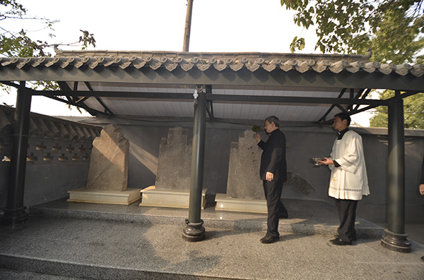 之后,部分神长及来宾来到河北省天主教神学院的西北角,由省天主教神学院常务副院长李占江神父和香港煕笃会圣母神乐院院长高豪神父为1937年煕笃会圣母神乐院所立的纪念碑重塑揭幕,高神父在致辞时说:“三个纪念碑中的一个纪念碑,是神乐院特别为文主教及同伴的致命所立的。文主教是神乐院最大的恩人,他在1927年邀请圣母神慰院前来建院,文主教慷慨地奉献了这块土地和所有的建筑物,作为熙笃会的神乐院。今天,特别借着这个机会,我们感怀这些前辈们,为了爱天主、爱众人,牺牲自己的生命,这三个墓碑为每个人来说是一个深深的纪念。”