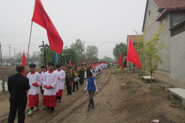 庆祝会结束后,开始了祝圣圣堂弥撒。由周村教区杨永强主教主祭,八位神父共祭。周村、张店、高庙李的腰鼓队,姜楼和临淄的乐队以及阳信、董杨的唱经班和辅祭班及近四百多位教友和四位修女组成的游行队伍,围着教堂开始了盛大的进堂仪式。本堂李玉训神父与主教开启圣堂大门后,祝圣典礼依次进行。在奉献礼之前有二十多个慕道者领受了洗礼,标志着沾化教会的复兴与发展。王神父在讲道中讲明为什么要奉圣母进教之佑为本堂主保,同时邀请大家多热心敬礼圣母,虔诚朝拜圣体。
