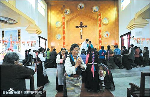 据悉,盐井天主教堂吟诵着译成藏文的《圣经》。当地的信徒领洗时以天主教会圣人圣女的名字取名,丧事也按天主教的礼仪举行。