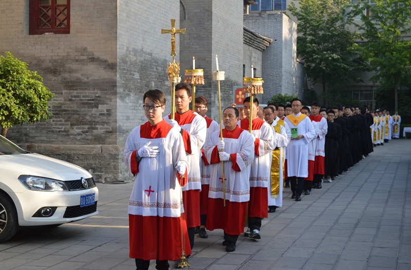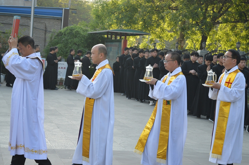 清晨的西安南堂圣堂院内清风徐徐、树叶婆娑,在郁郁葱葱的圣堂院落东侧,游行队伍整齐列队,7:30分,进堂仪式开始,吊炉为前导,后面依次是十字、蜡杆、福音、病人圣油、候洗圣油、圣化圣油、读经员、修士、修女、神父和主教,进堂式中,主教一路降福参礼的教友们,教友们毕恭毕敬地划着十字、鞠躬致谢。