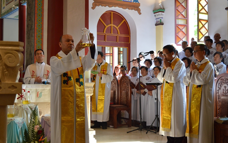 在圣道礼仪后,举行了庄严神圣的重宣司祭圣职的许诺礼。随后,主教祝圣了“病人圣油”,在平安礼中,主教与参礼的神父们亲切握手、拥抱,互祝平安。在领圣体礼后,主教分别祝圣了“候洗圣油”、“圣化圣油”,在祝圣“圣化圣油”时,全体共祭神父伸出右手,向圣油覆手。