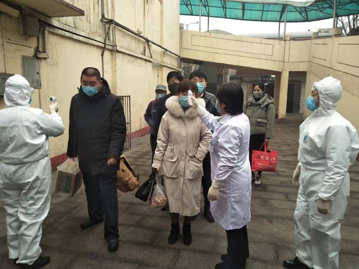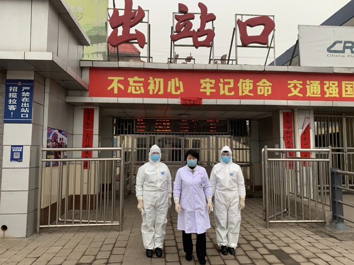 山西霍州同德医院张院长带领医院工作人员在火车站为下车旅客测量体温