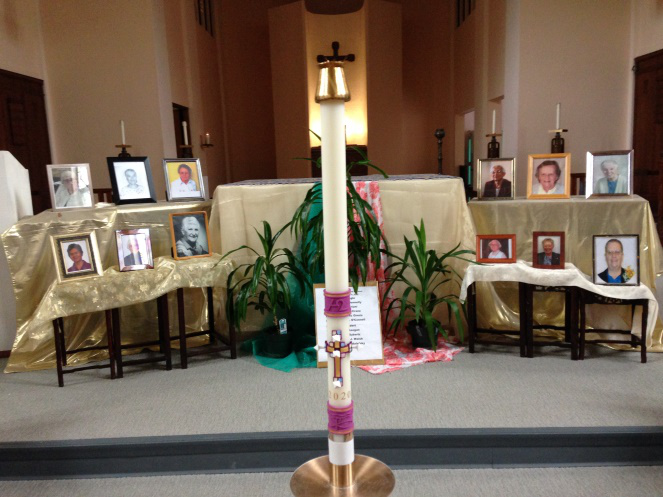 这张照片展示了那时我们为我们过世的修女所举行的特殊庆典——她们不都是死于新冠,但全是在这一特殊时期,在很短的时间内过世的修道人。(The photo here shows how, at one point, we had a special celebration for our Sisters, who had died—not all from the virus— but during a relatively short time period of time.)