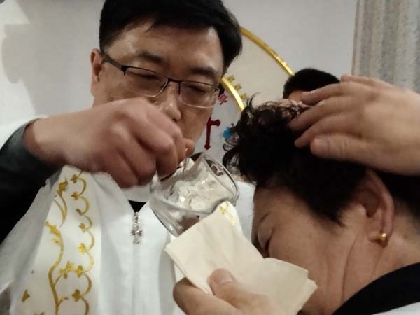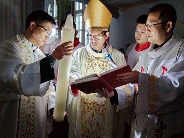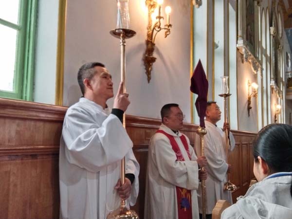 4月3日圣周六晚上6点,五家庄主教座堂开启了隆重的烛光守夜礼,方建平主教主礼,任大海神父、赵希成神父、张海平神父共祭,祝圣圣火、圣蜡、圣水。16名慕道者在弥撒中领受了洗礼,方主教为受洗的教友颁发了耶稣圣心像和念珠作为纪念。