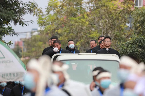 11时许,告别礼后,在萧瑟的秋风中,杨祥太主教灵柩被扶柩发丧至教区公墓。灵车上有10位神父护卫灵柩。前来送行的人依次跟随其后,默默地送主教最后一程。在疫情防控的期间,整个礼仪简约而不失神圣与庄严。