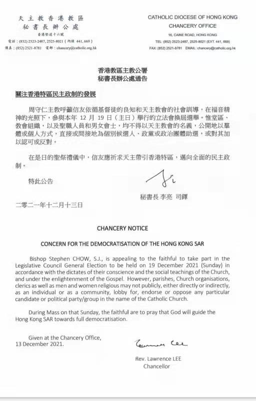 日前12月13日,香港教区新牧周守仁主教通过主教公署秘书长办公室李亮神父向香港全区各堂区、教区机构、男女会士发出《通告》,“呼吁信友依循基督徒的良知和天主教会的社会训导,在福音精神的光照下,参与本年12月19日(主日)举行的立法会换届选举。”