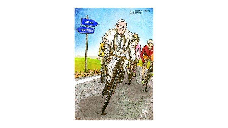 最新画作于3月18日公布。图画呈现出教宗带头踏着自行车,三名年轻人紧追在后,一同朝着“公共利益”的方向前行,他们身后反方向的路标指示通往“利润”。
