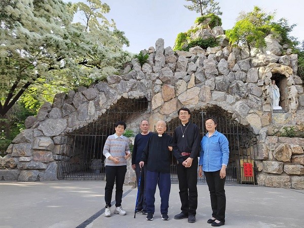 (自左至右)孙洪玫修女、王占国修士、郭夫德神父、孙建波神父、李霞修女于2024年复活节后在戴庄天主堂圣母山前