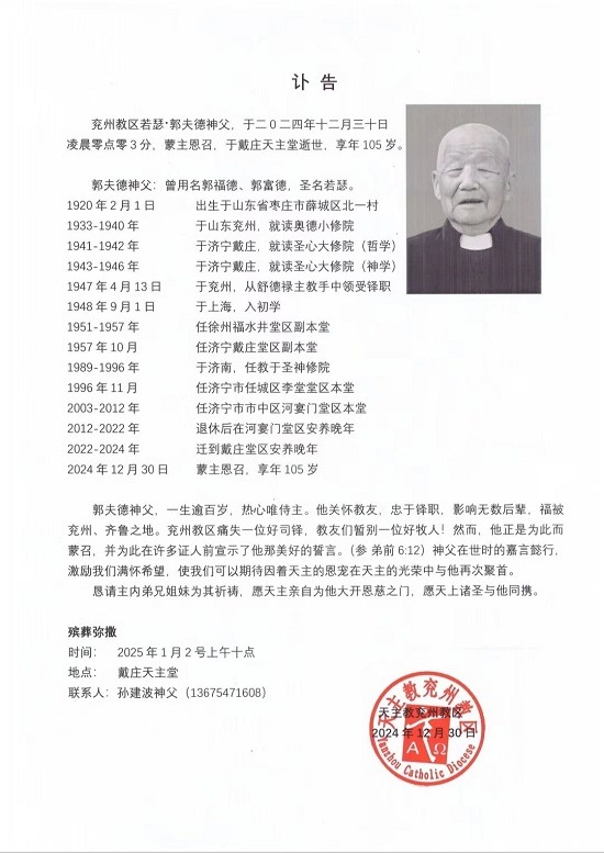 愿郭夫德神父在天上做当地教会、山东教会、中国教会及奉献生活团体的主保!在天乡父家继续为大家代祷!愿这位辛苦了一生的百岁司铎安息天乡!