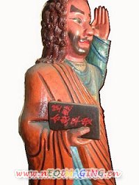 黄神父走到供台上,移动神像,左敲敲右敲敲,断定是木制品。我学的是美术专业,凭我粗浅的知识认为:此物应该是旧时的“国产”,西方的雕塑整体来说比例协调,而这个雕塑比例明显有些失调,头部显得大些,这跟明清时期的塑像和画像基本相同,明清时期的风格和表现手法基本如是。而且这尊塑像做工并不精细,跟其他两个塑像——正中的水仙老爷、右边的港神伯公相比起来略微粗糙些,感觉好像不是同时期、同地方的作品。水仙老爷和港神伯公都是盛袍隆装,而希伯来民族装束的番公显得朴素多了:蓝色的长袍,斜披着红色的外氅,没有镶金缀珠的帽子,只有一头深褐色的卷发,赤着脚,一手拿一本厚厚的黑皮圣经,另一手高举作祝福状。