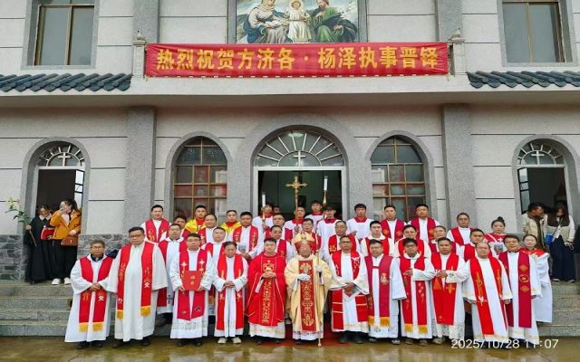 2025年10月28日上午,天主教昆明教区在曲靖市罗平县雨落天主教堂为杨泽执事举行司铎祝圣典礼。典礼由昆明教区马英林主教主礼,全省天主教26名司铎代表参与共祭,新铎亲属、各堂口信教群众代表参礼。典礼整个过程井然有序,庄重简朴。杨泽司铎,云南罗平人,彝族,先后就读于河北省天主教神学院、中国天主教神哲学院。2024年
