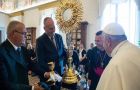教宗方济各6月19日上午在梵蒂冈接见美国圣体大会筹备委员会成员(Vatican Media)教会建立至今两千年以来,基督徒一直面临一大危险,即:将基督于饼酒内的真实临在与“象征”相混淆,把爱的现实与抽象标记混为一谈。教宗方济各6月19日上午在梵蒂冈接见美国圣体大会筹备委员会成员时,提醒了这点。教宗从耶稣行的增饼奇迹谈起
