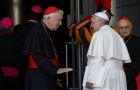 尼格老枢机在去年的非常主教会议期间与教宗方济各交谈。(图片来源:天美社) 英国有逾五百名教友联署,支持早前由约四百六十名神父发出