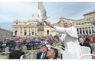 教宗方济各释放和平鸽(梵蒂冈电台讯)教宗方济各2015年第48届世界和平日文告呼吁众人成为兄弟姐妹,促进世界的和平。这份文告的标题为不再