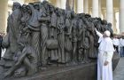 圣伯多禄广场上移民群雕贴置二维码,以更了解移民现实状况