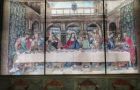 经纬交错的达芬奇《最后晚餐》壁毯画在梵蒂冈博物馆画廊的拉斐尔展览厅供人观赏。这张壁毯画是米兰恩宠之母修院餐厅壁画的复制品。法国国王路易十二世对文艺复兴大师的这幅原版画作一见倾心,有意从墙上挖下壁画,把它从米兰带回巴黎。后来,法王法兰西斯一世登基,决定把壁画变成织毯艺术品。这幅壁毯复制品的准确编织地点