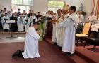 信德讯 2024年10月1日,西安教区伯多禄·陈攀飞修士祝圣执事典礼于陕西天主教神哲学院举行,典礼弥撒由西安教区党明彦主教主礼,修院常务副院长李景玺神父为主教推荐候选人并证明他确有资格领受执事圣职,33位神父、3位执事参与共祭。国庆节当天,也是陕西天主教神哲学院主保圣女小德兰瞻礼,党主教带领大家为国泰民安祈祷,