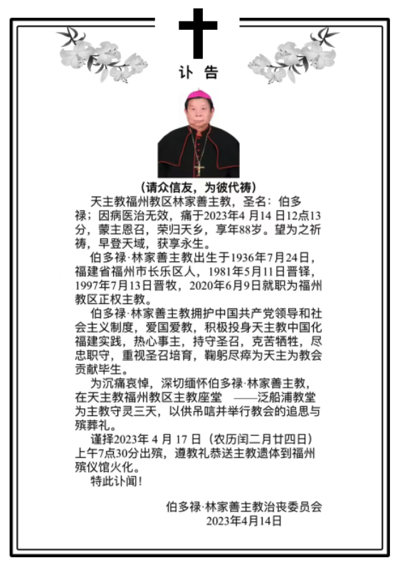 昨天下午,福建省天主教“两会”发出讣告后,当日下午中国天主教“一会一团”发去了唁电。(唁电内容参见:中国天主教)