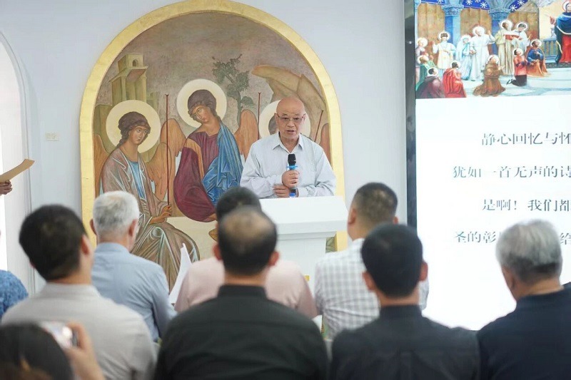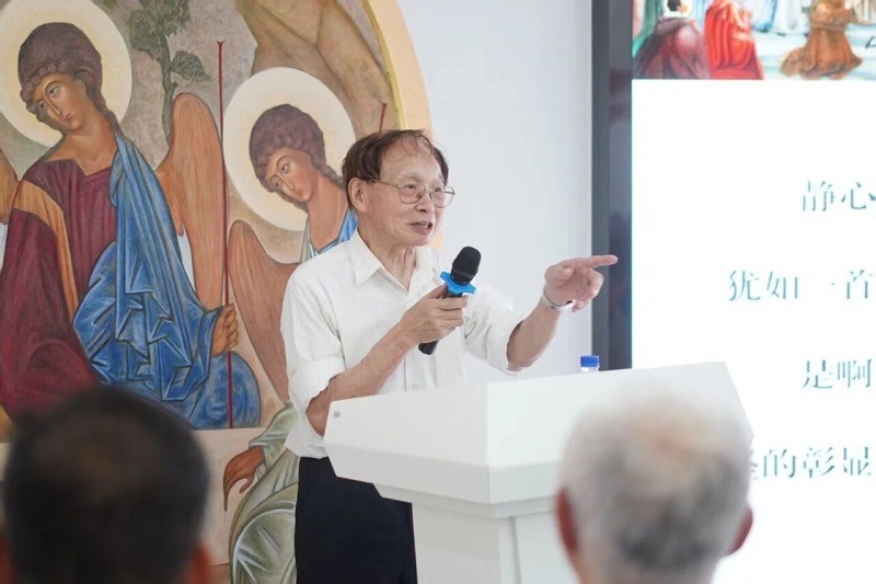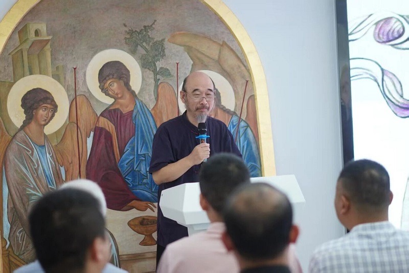 北京教区赵建敏副主教深入解读了画作的精神意涵。他以"凝视者与被凝视者"的关系为切入点,指出东方岩彩圣像画不仅呈现自然之美,更开启心灵与永恒的对话。他强调,真正的艺术应融汇真理与仁爱,回应人类对无限的渴慕。