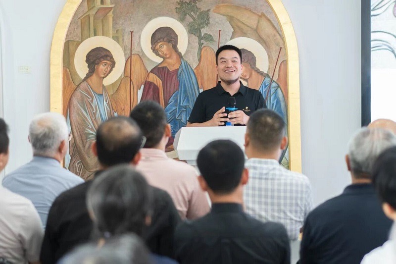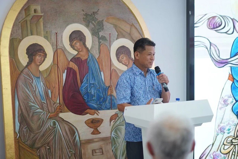 开幕式上,王江飞神父代表主办方致欢迎辞。他表示,王怀爱先生的艺术创作始终植根于信仰的追寻与中华文化的传承。其独创的东方岩彩圣像画,融汇中国传统岩彩技法与天主教圣像艺术精髓,正是天主教宗教中国化理念的积极探索与具体见证。此次展览落地浙江,实为浙江天主教界的一大盛事。