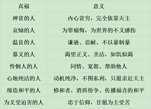 《天主教教理》第1716-1729条详细解释了真福八端,指出:
