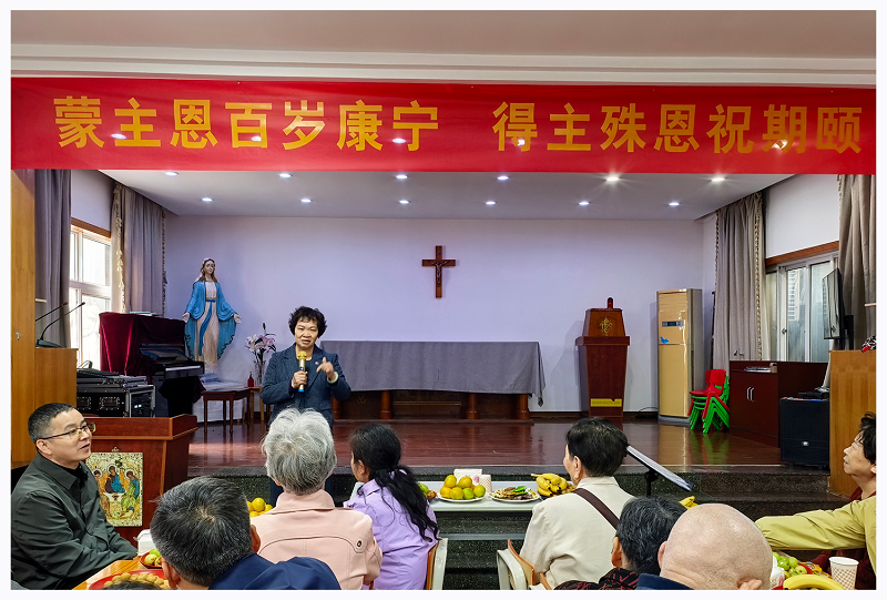 本堂王圣军神父在致辞中,首先向参加重阳节庆祝活动的所有老人致以节日问候,并介绍了重阳节的意义,以圣经中“应孝敬你的父亲和你的母亲”(出20:12)为引,呼吁大家尊老、敬老、爱老、助老,并希望老年教友做好信仰的传递和信仰的美好见证。堂口精心为年长者们奉献了一台精彩的节目,不但有舞蹈还有堂口雅歌圣乐团献唱《愿主祝福你》和《回到主前》,为长者祈求平安喜乐,在岁月沉淀中坚守信仰的信心。